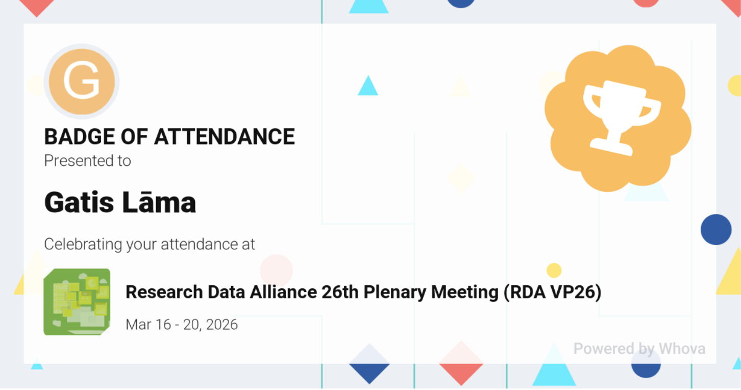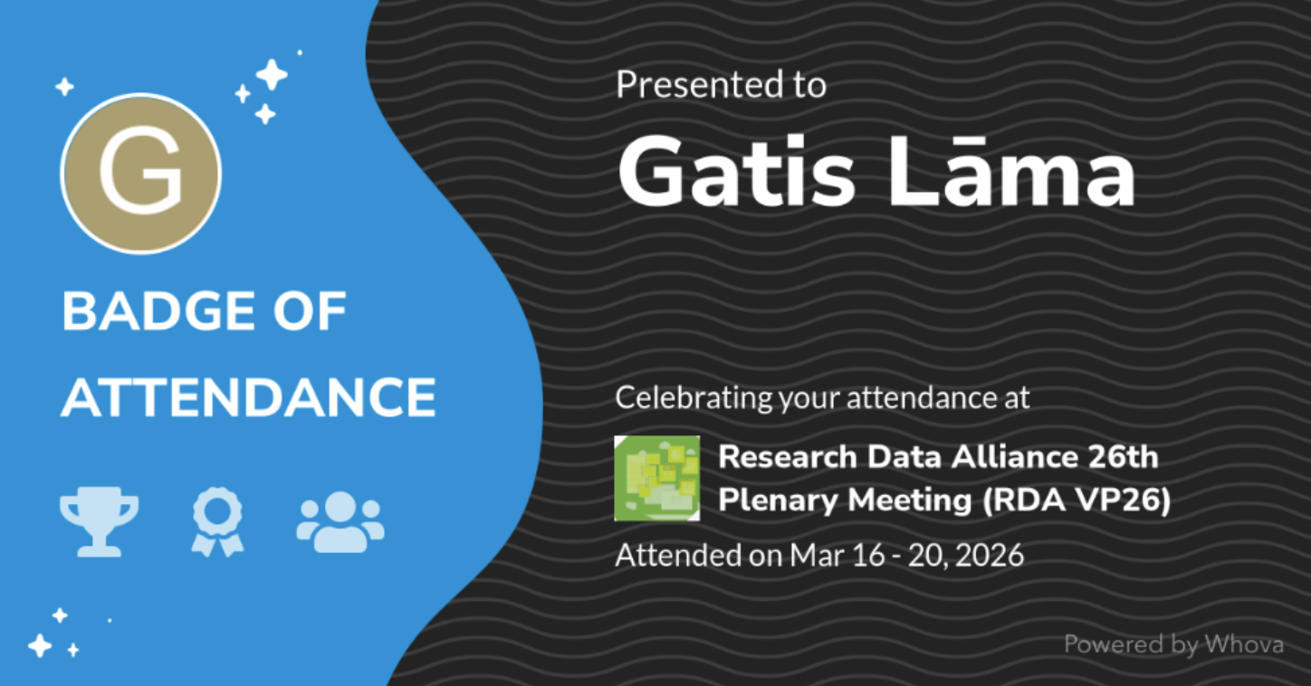 The 26th plenary session of the Research Data Alliance (RDA) (RDA VP26) took place online from March 16–20. Gatis Lāma, a representative of the Latvian Data stewards network and data curator at Riga Technical University, also participated, gaining an up-to-date insight into the development of research data management and its importance in ensuring sustainable research. The event was joined by 316 participants from the international research data community from 40 countries, analysing issues of data accessibility, interoperability, management and sharing in joint discussions.