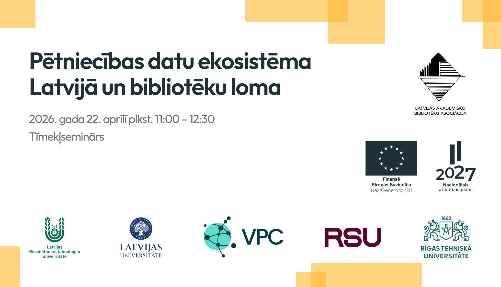 2026. gada aprīlī notika vebinārs "Pētniecības datu ekosistēma Latvijā un bibliotēku loma", kuru organizēja Augstākās izglītības un zinātnes IT  koplietošanas  pakalpojumu centrs (VPC) sadarbībā ar Latvijas Akadēmisko bibliotēku asociāciju (LATABA). Vebinārs pulcēja vairāk nekā 120 dalībniekus no akadēmiskām un publiskām bibliotēkām, kā arī citām institūcijām. Tēmas, kas saistītas ar atvērto zinātni, datu pārvaldību, pētnieku atbalsta pakalpojumiem, prezentēja kā arī uz jautājumiem atbildēja datu kuratori no VPC, RSU un RTU.