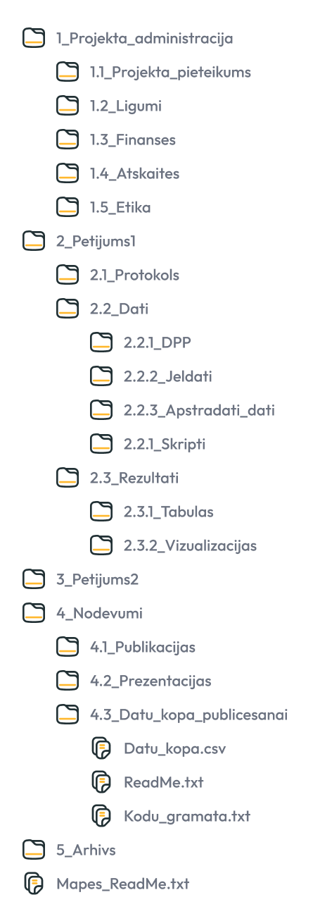 A clear and well-organised folder structure is essential for effective research data management. It is important to develop a folder system that reflects the structure, workflow and responsibilities of the project from the early planning stage. This ensures that data, documentation and results are easy to find, understand and manage throughout the project life cycle and beyond, and that the structure is understandable to people not involved in the project.