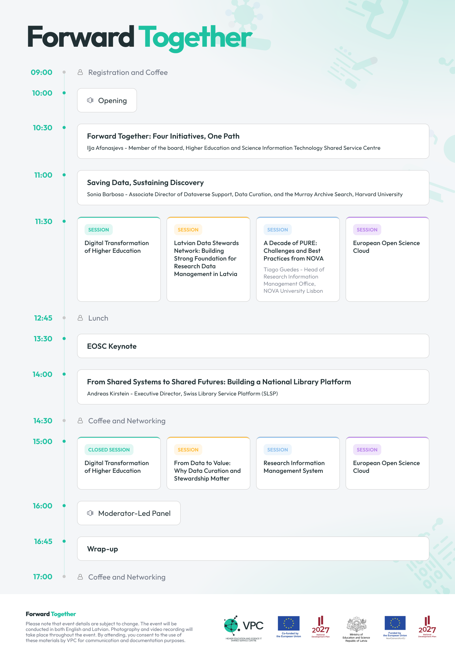 Šajā pilnas dienas konferencē demonstrēsim jaunus digitālos rīkus un pakalpojumus, kas jau ir vai nākotnēbūs pieejami pētniekiem, zinātniskajām institūcijām un citiem interesentiem. Konferencē būs iespēja iepazīties ar iniciatīvu progresu, plānotajiem risinājumiem un toietekmi uz augstākās izglītības un zinātnes attīstību Latvijā, kā arī diskutēt ar nozares ekspertiem un sadarbības partneriem, piedalīties paneļdiskusijās un interaktīvajās darbnīcās. Konferencē aplūkosim, kā nozares attīstība veidos Latvijas zinātnisko un akadēmisko vidi nākotnē, kā arī izcelsim katra projekta līdzšinējos sasniegumus un plānoto virzību.